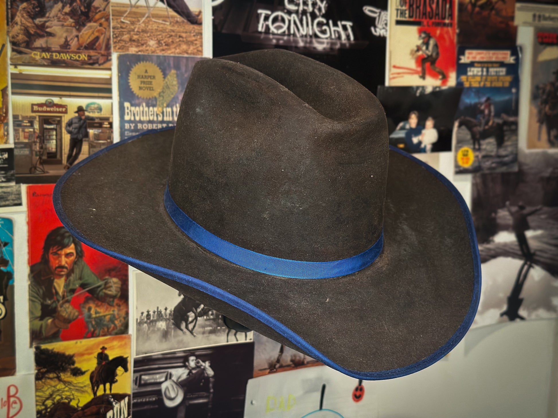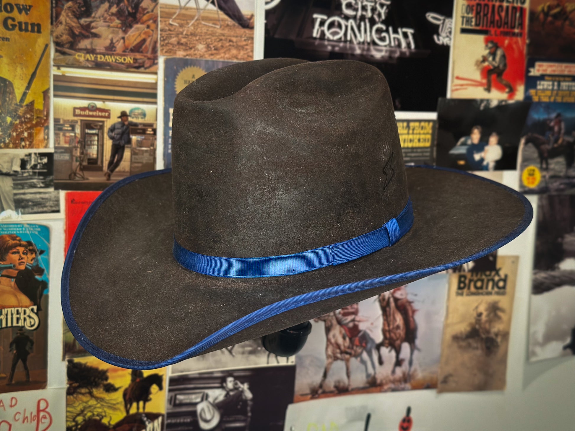 Step into timeless Western craftsmanship with this one-of-a-kind distressed brown beaver felt hat from Three Horses Hat Co. Handmade in Nashville, TN, this hat features a cattleman crease crown, vintage blue grosgrain ribbon, and a classic western brim for a bold yet refined silhouette. Crafted from 100% pure beaver felt, it’s built to last a lifetime—water-resistant, shape-holding, and naturally breathable.